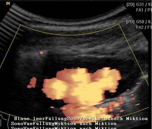 Mit diesem Ultraschall-Kontrastmittel sind die genausten Ergebnisse zu erzielen. Die Genauigkeit (Sensitivität) kann noch dadurch erhöht werden, wenn man zusätzlich noch die Miktion unter Farbkodierung (farbkodierte Dopplersonographie) nach Gabe von SonoVue® beobachtet. SonoVue® wird über einen dünnen Blasenkatheter in die Harnblase gegeben und macht den Harn vorübergehend für den Ultraschall sichtbar und bei Farbkodierung sogar in äußerst geringen Konzentrationen.